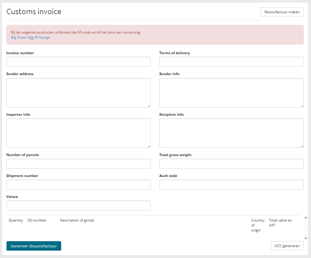 Wanneer je op Douanefactuur klikt, heb je de mogelijkheid om een douanefactuur te genereren.