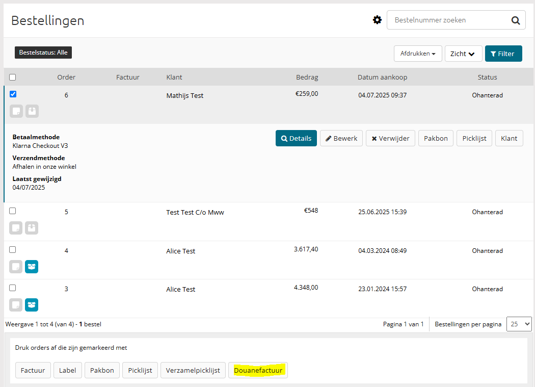 De app is volledig automatisch. Wanneer er een order binnenkomt uit een ander land dan Nederland, krijg je een optie op de order om een Douanefactuur te kiezen.