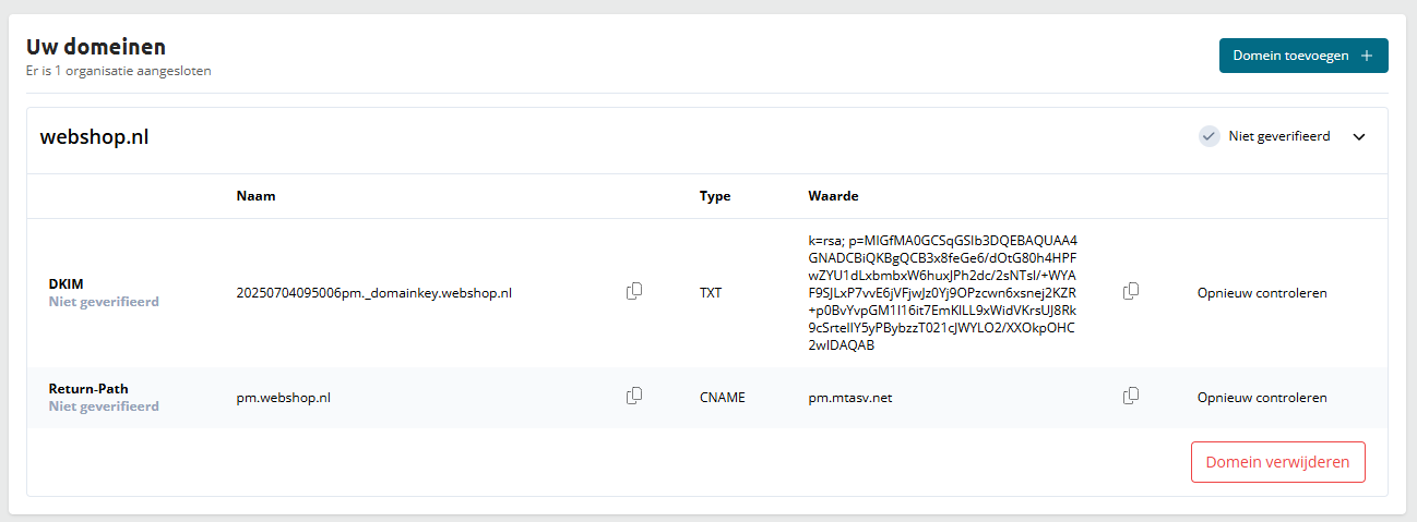 - Als het domein al geverifieerd is via een ander Acendy webshop, ontvang je alleen DKIM-records voor de overige webshops.