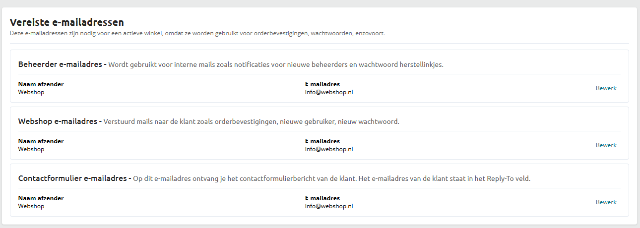 - Webshop e-mailadres: dit mailadres wordt gebruikt voor mails naar je klanten toe, zoals de orderbevestigingen en de wachtwoorden voor hun klantaccounts.
