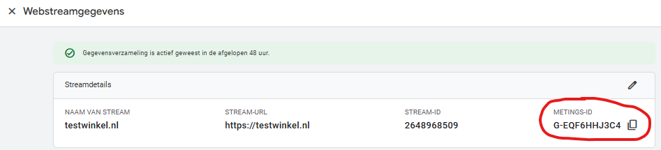 In de module vind je een veld met het label "GA4 ID". Voer hier je measurement-ID van GA4 in. Je Measurement-ID kun je vinden door in te loggen op GA4 en te navigeren naar Beheer (tandwiel linksonder) > Gegevensstreams en vervolgens te klikken op de gegevensstream van de site (>).