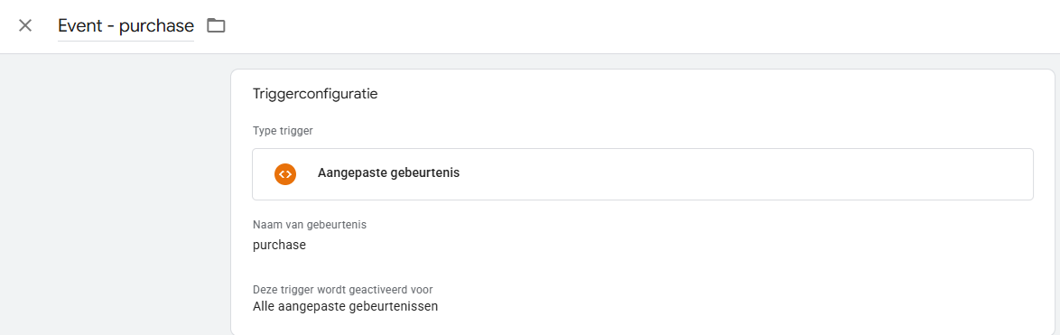 - Klik op Triggers maak een 'aangepaste gebeurtenis' met Naam van gebeurtenis 'purchase'. Deze trigger zorgt ervoor dat dit event wordt afgevuurd als er een aankoop plaatsvindt in je webshop.