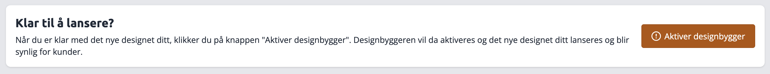 Naviger til Meny > Design > Utforsk designbyggeren, om du har disse menypunktene er det en indikator på at designet ikke er aktivert. Om du inne på "Utforsk designbyggeren" fortsatt har seksjonen "Klar til å lansere" i bunnen er ikke designbyggeren aktivert.