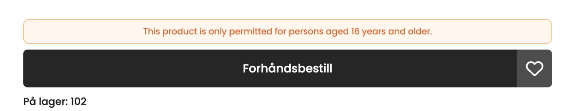 Om et produkt er markert som "16+" vil det vises en banner over kjøpsknappen som informerer om at alder må verifiseres i handlekurv før kjøp kan gjennomføres.