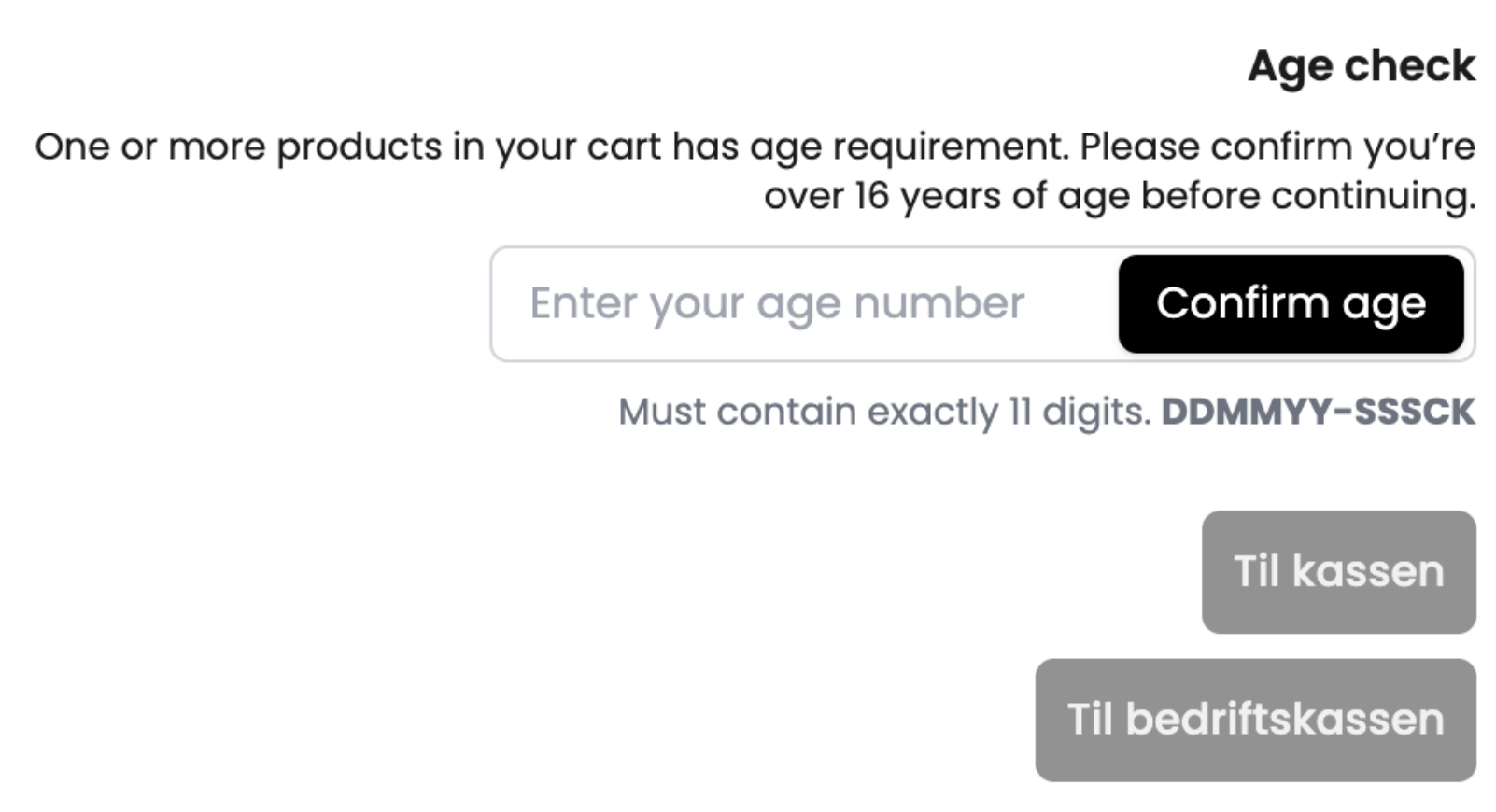 Om handlekurven inneholder ett eller flere produkter som er markert som 16+ vil sluttkunde måtte verifisere sin alder før knappen for kasse blir aktiv.