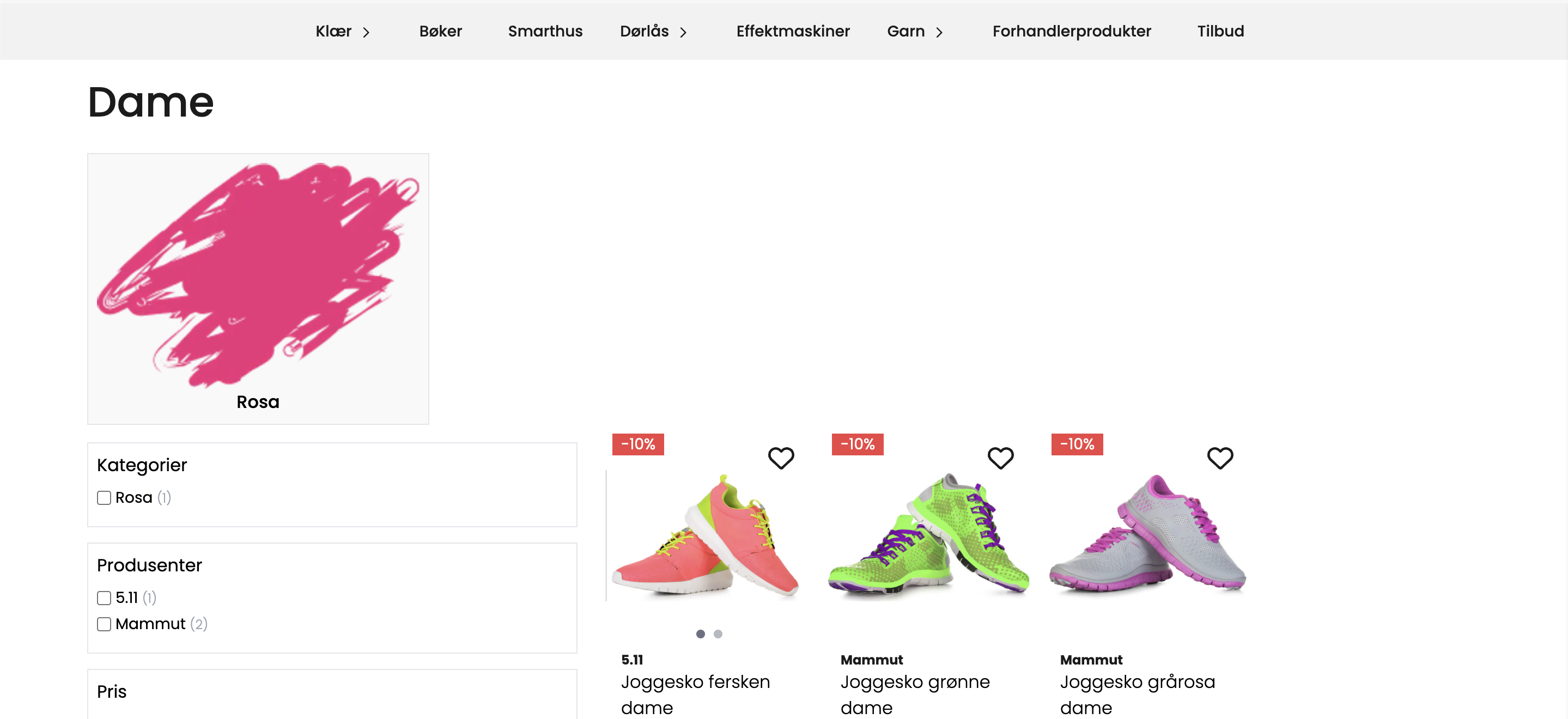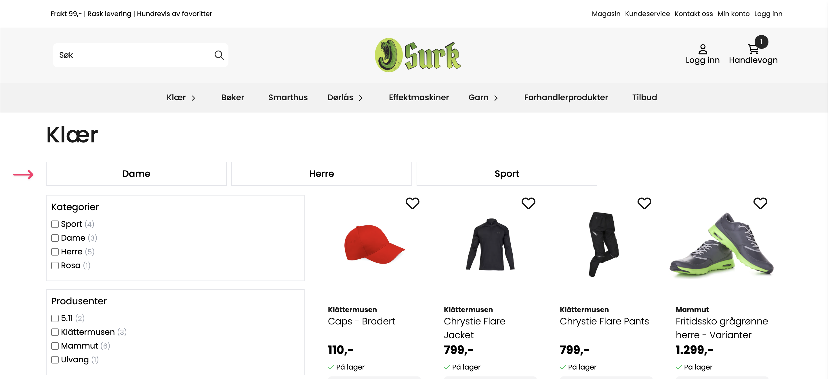 I eksemplet under ser vi hvordan kategorien "Klær" viser direkte underkategorier. Hadde vi gått videre inn på kategorien "Dame" ville vi sett dens underkategorier.