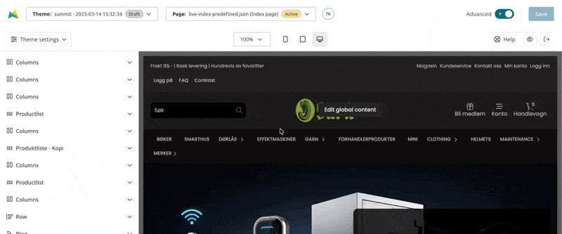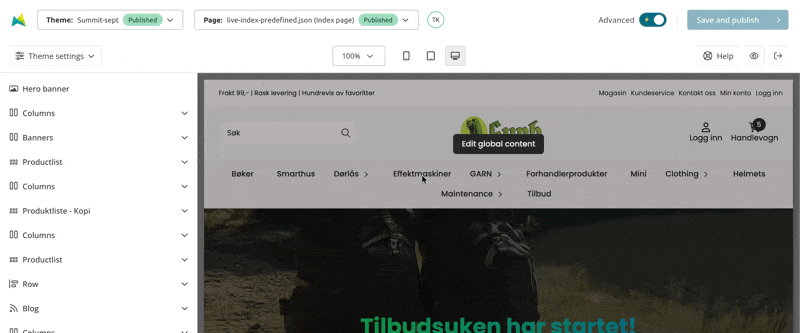 - Rediger temaet der siden du ønsker å eksportere finnes
