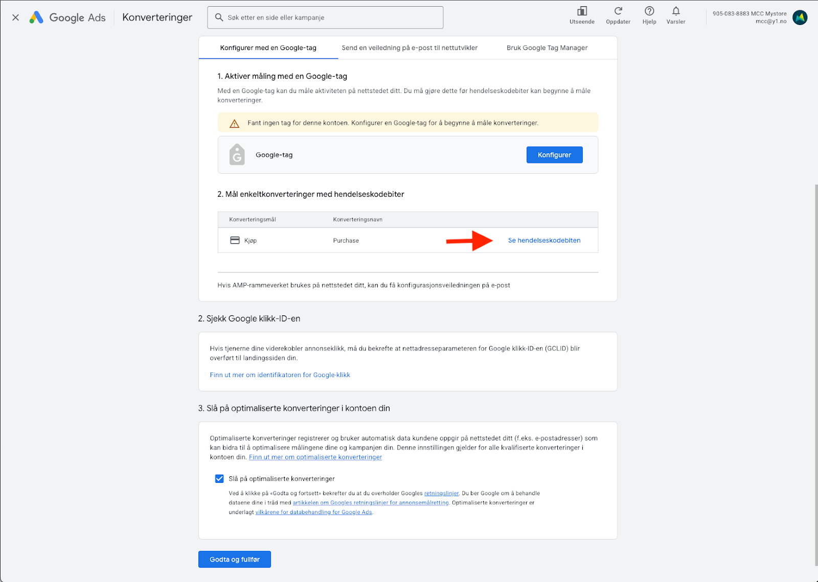 Steg 2: Legg inn Google-tag (AW-kode) i Mystore kontrollpanel