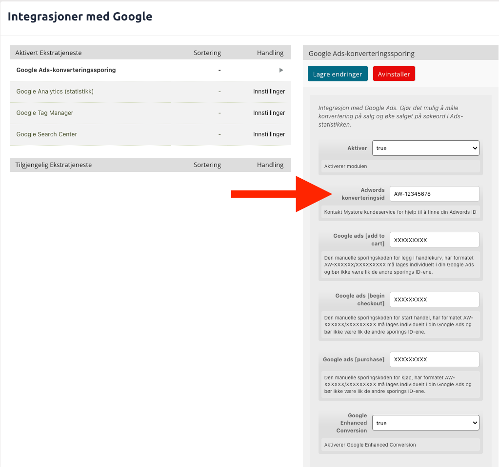 Steg 8: Med AW-kodebiten kopiert og klar, navigerer du deg til ditt kontrollpanel og finner Google-tjenestene ("Konfigurasjon" > "Google"). Lim inn koden i Google Ads konverteringssporing, aktiver Enhanced Conversions(sett til: True) og husk og lagre endringene når de er lagt til.