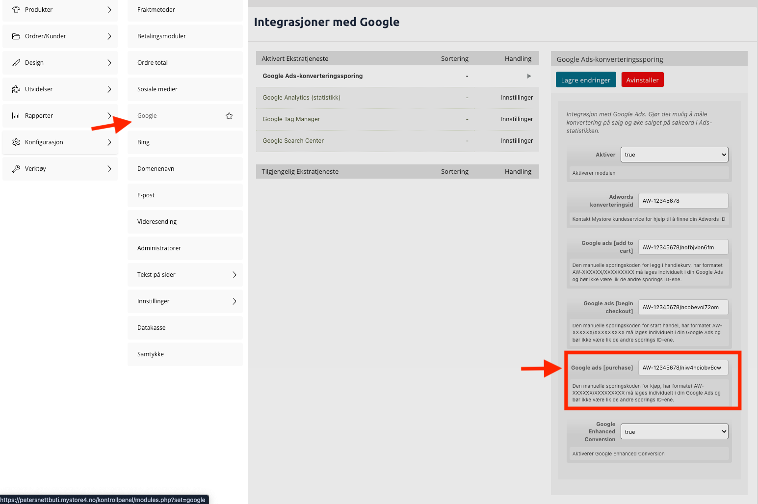 Steg 3: Logg inn i Mystore kontrollpanelet > "Konfigurasjon" > "Google" > Aktiver "Google Ads konverteringssporing" > Lim inn AW-koden i feltet “Adwords konverteringstid"