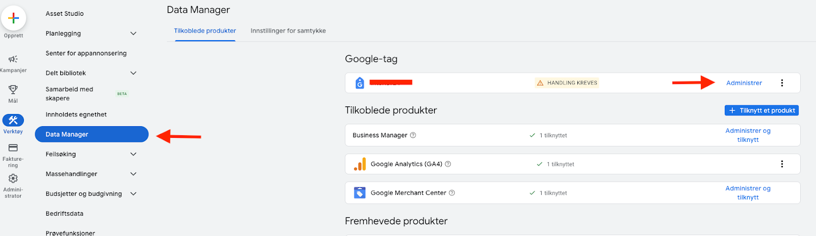 Gå til Verktøy > Data Manager > Trykk “Administrer” ved Google-taggen