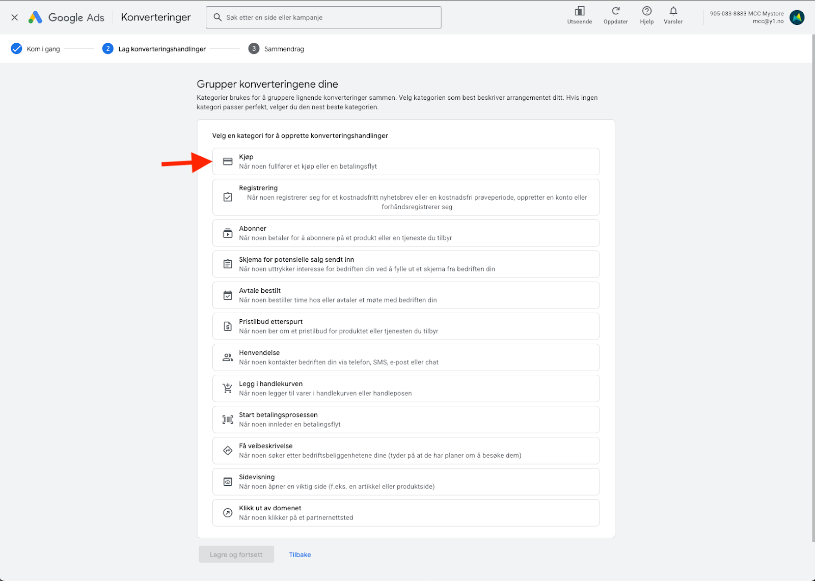 Steg 6: Velg Konverteringssporingen “Kjøp”