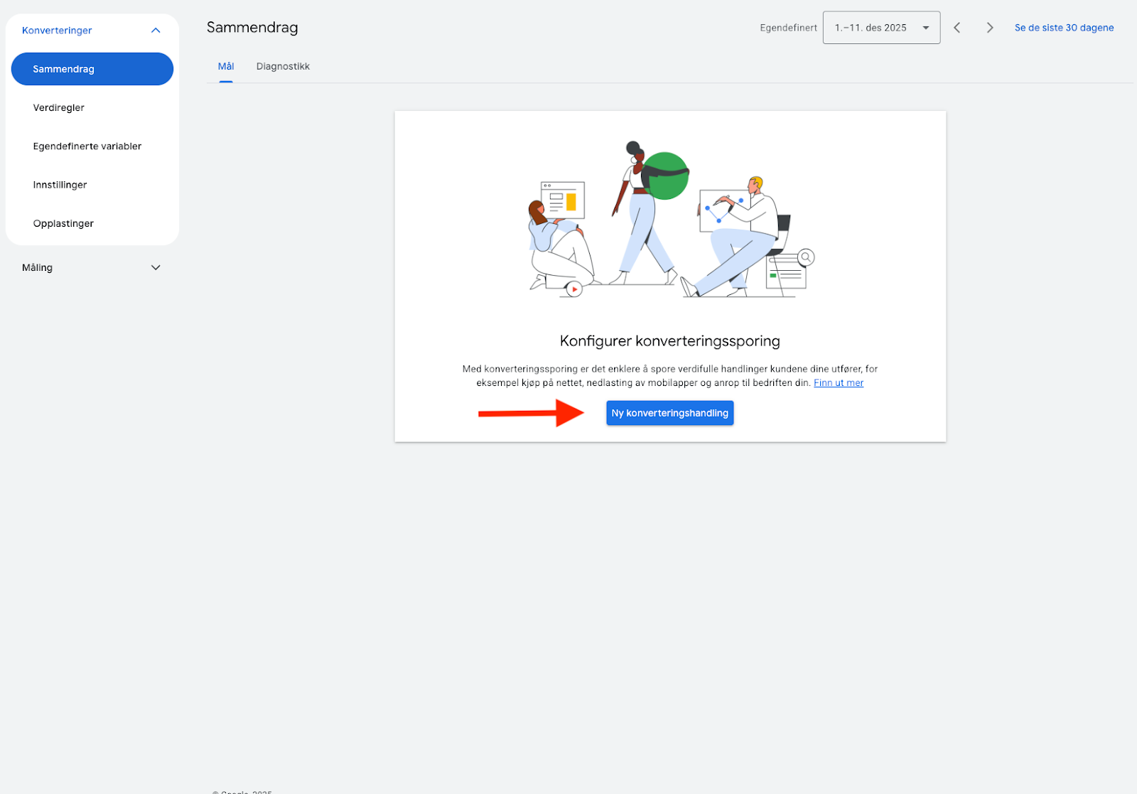 I Google Ads, klikk på "Mål" i sidemenyen og deretter "Sammendrag". Klikk på det blå ikonet "+Opprett en konverteringshandling"