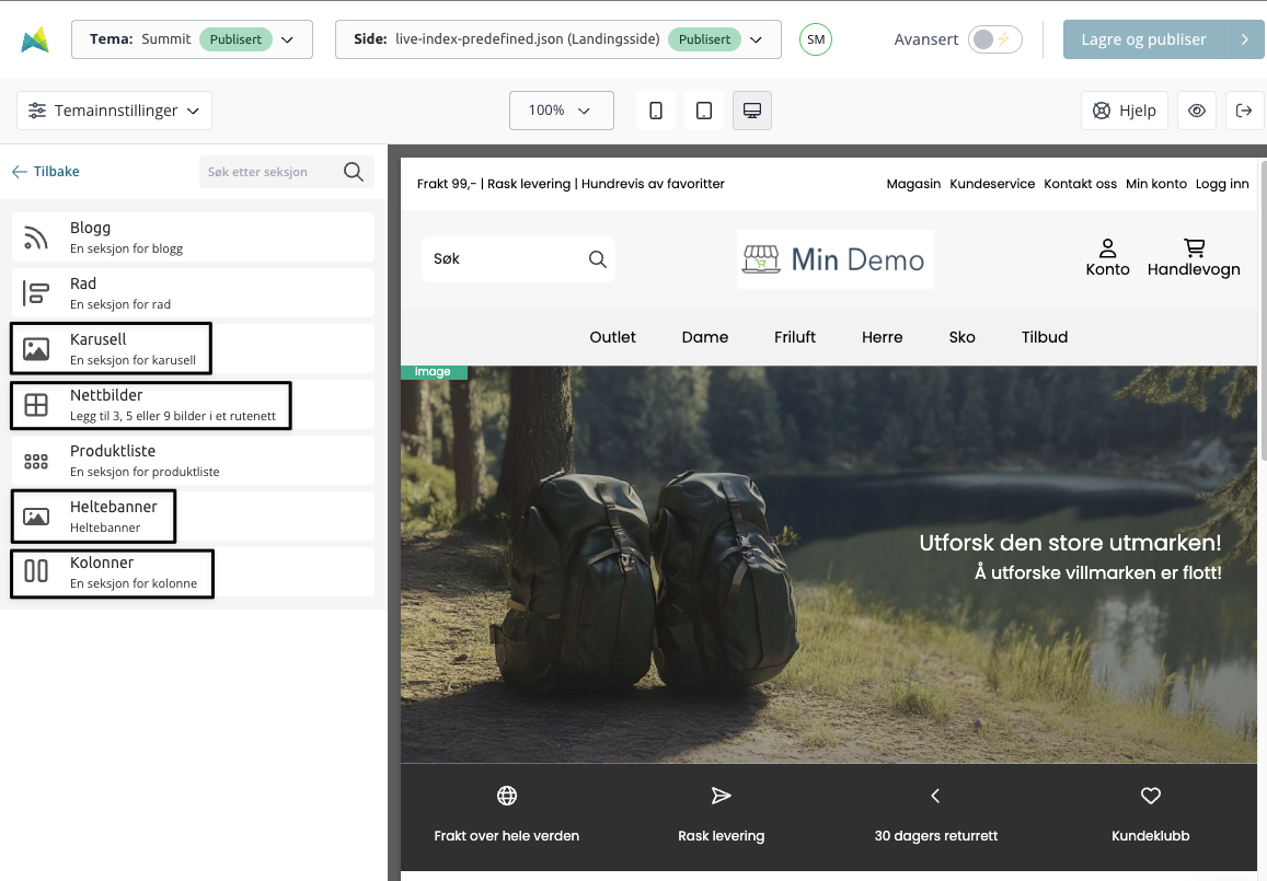 Landingssiden til designbyggeren gir en oversikt over butikkens forside. Dette er det første kundene ser når de åpner nettbutikken din, så det er viktig at siden er attraktiv, ryddig og raskt gir et innblikk i produkttypene du tilbyr.