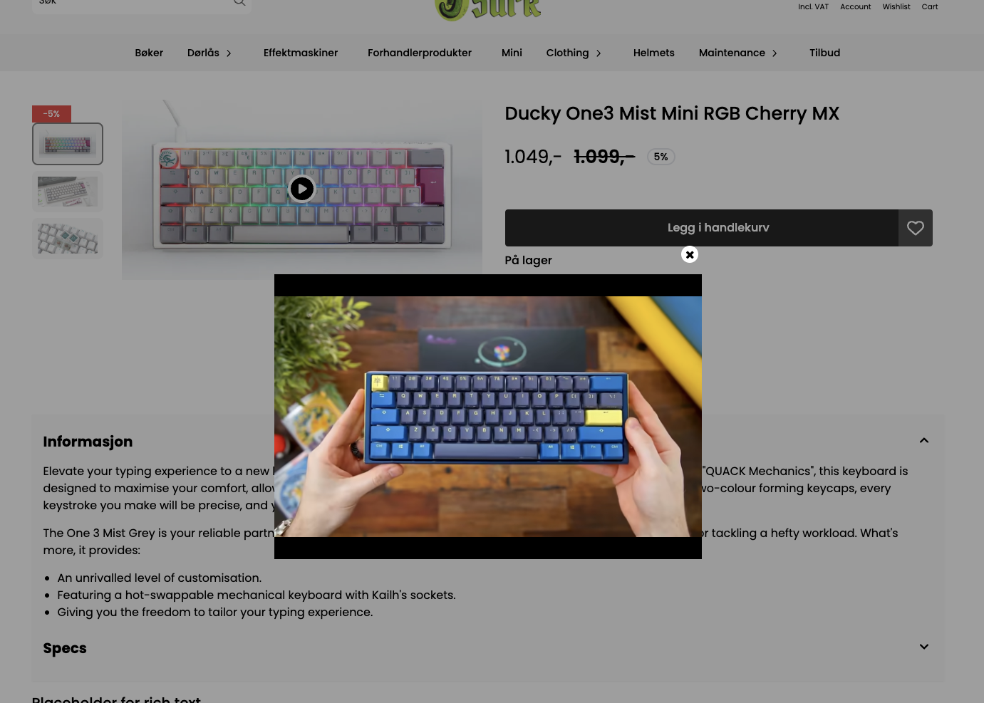 Når en videolink er lagt til via en tagg, vil det dukke opp en "Avspill"-knapp over produktbildet. Når kunden klikker på denne, åpnes videoen i et eget popup-vindu for en fokusert seeropplevelse.