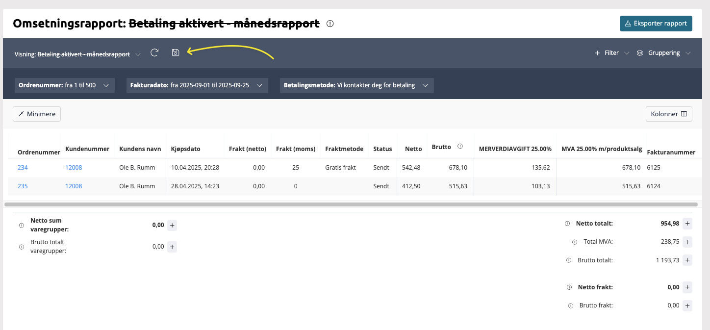 Etter at du har konfigurert rapporten med de ønskede filtrene, kolonnene og grupperingene, må du lagre den som en ny visning.