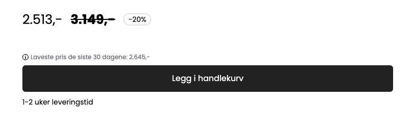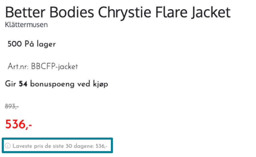 Her vises laveste pris siste 30 dager som en egen linje på produktsiden.