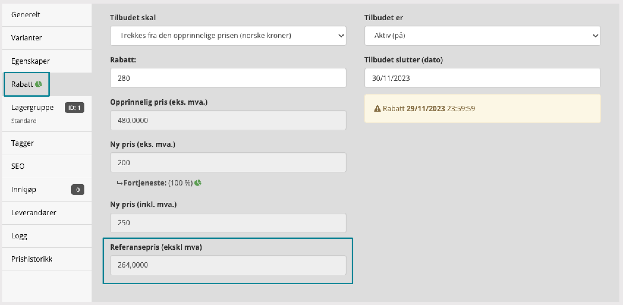 I menypunktet for rabatt har du nå tilgang til et nytt felt for “Referansepris”. Denne prisen er den laveste som er registrert på produktet de siste 30 dagene, og verdien hentes fra prishistorikken.