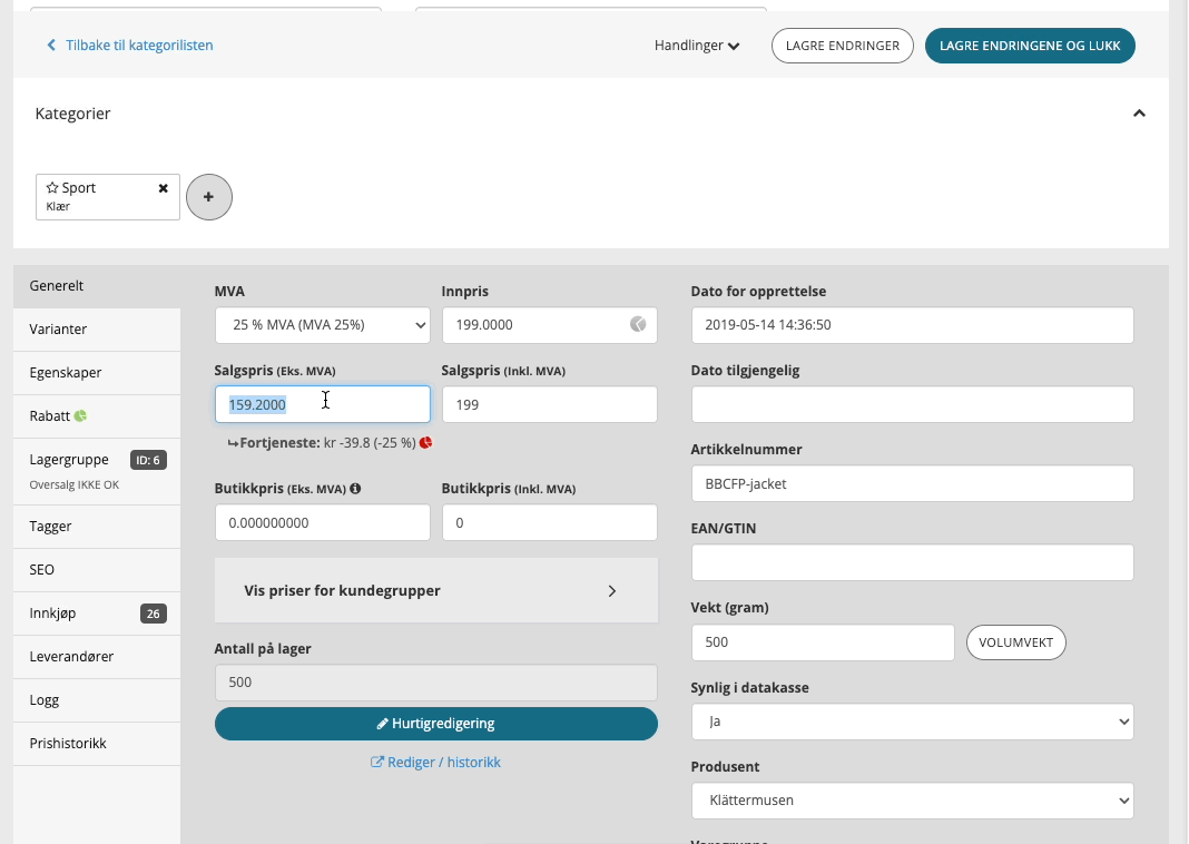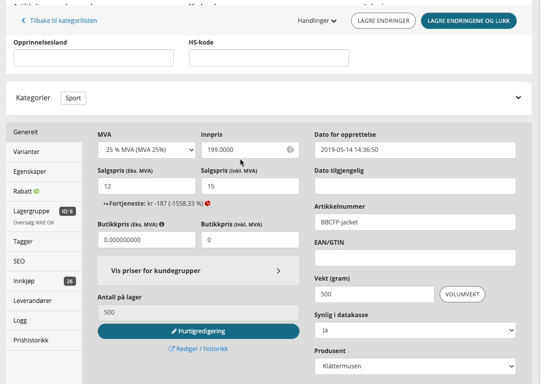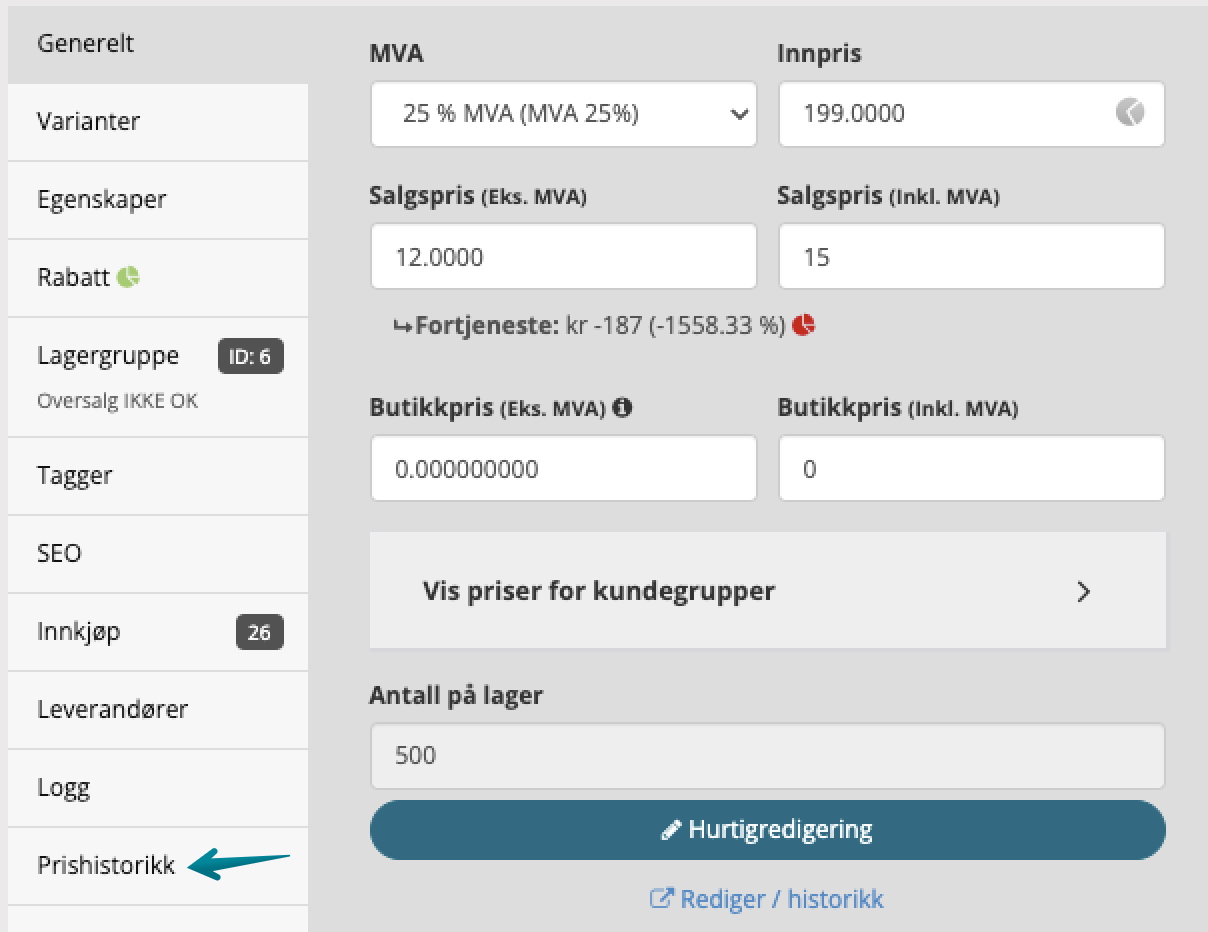 NB! Husk å korriger prisen på produktet før du korrigerer i historikken.