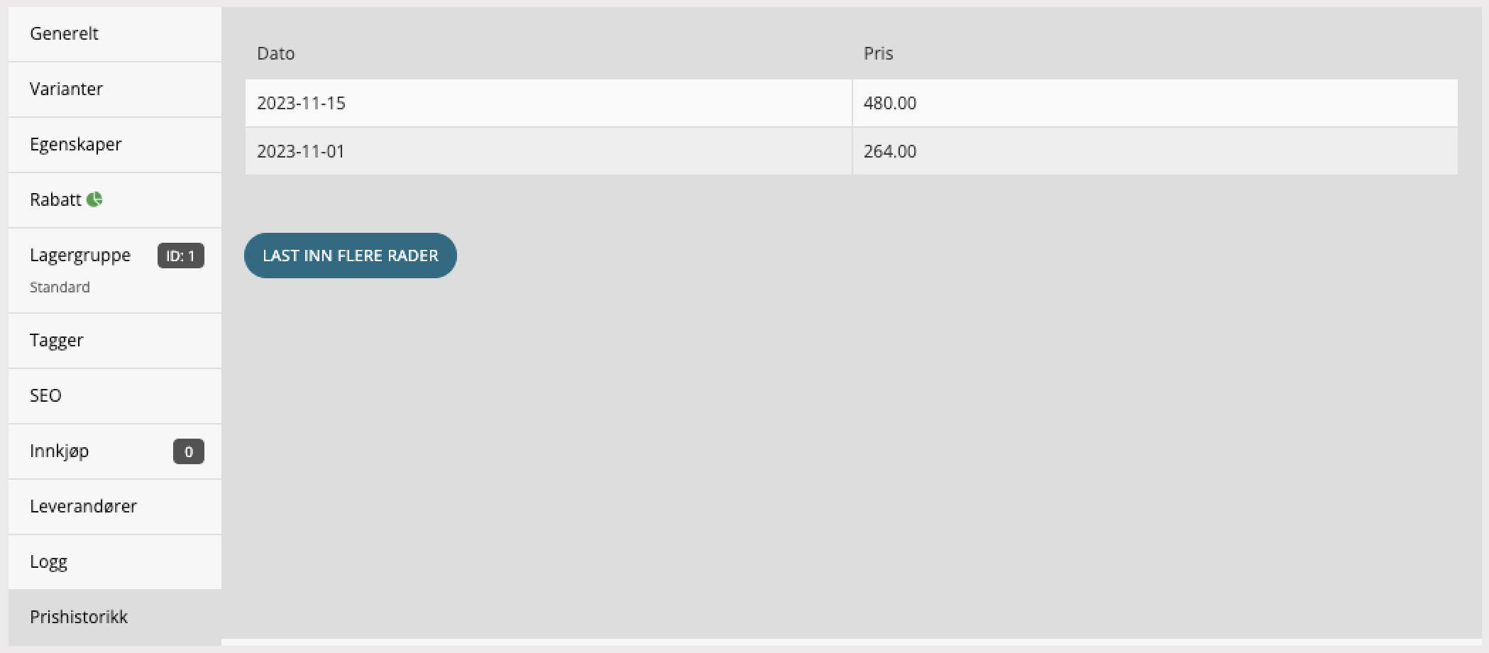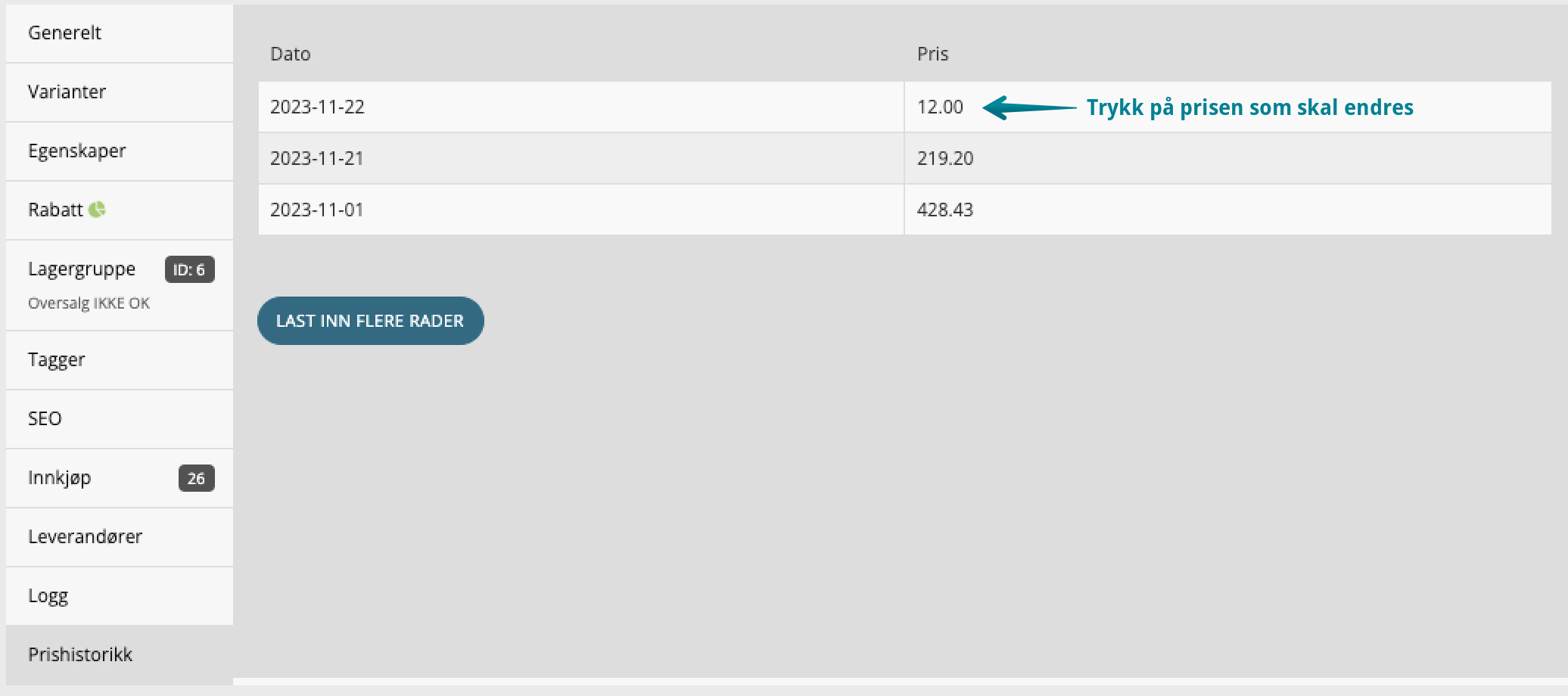 2. Trykk på “Prishistorikk” inne på produktet som skal endres.