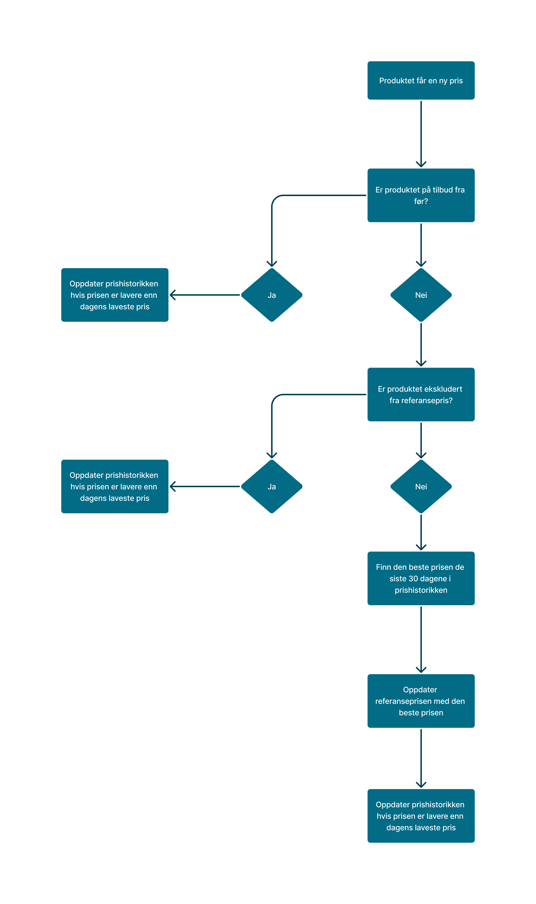 Førprisen som vises er den laveste prisen som har vært på produktet siste 30 dager, men det er noen regler som er kjekt å vite om. Se flytskjema under for en innføring i hvordan prishistorikken oppdateres i kontrollpanelet.
