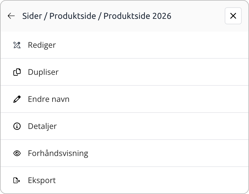 - Rediger: Denne vises kun om du åpner valgene for en side du ikke allerede redigerer.