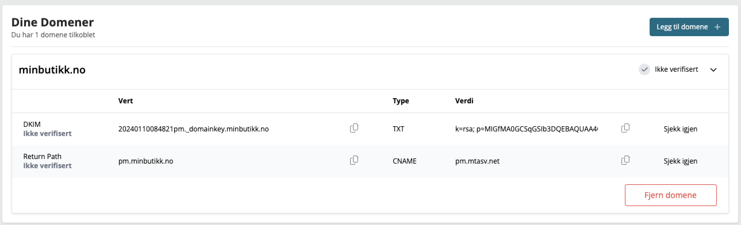 Disse verdiene må kopieres og legges inn hos din domeneleverandør.