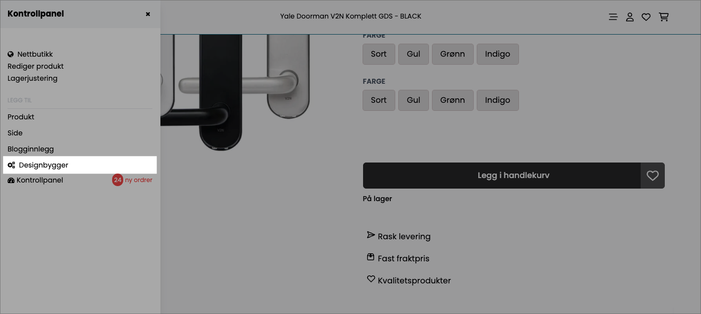 Om man er innlogget som admin og åpner designbyggeren fra nettbutikken (frontend) vil man åpne den siden man står på.